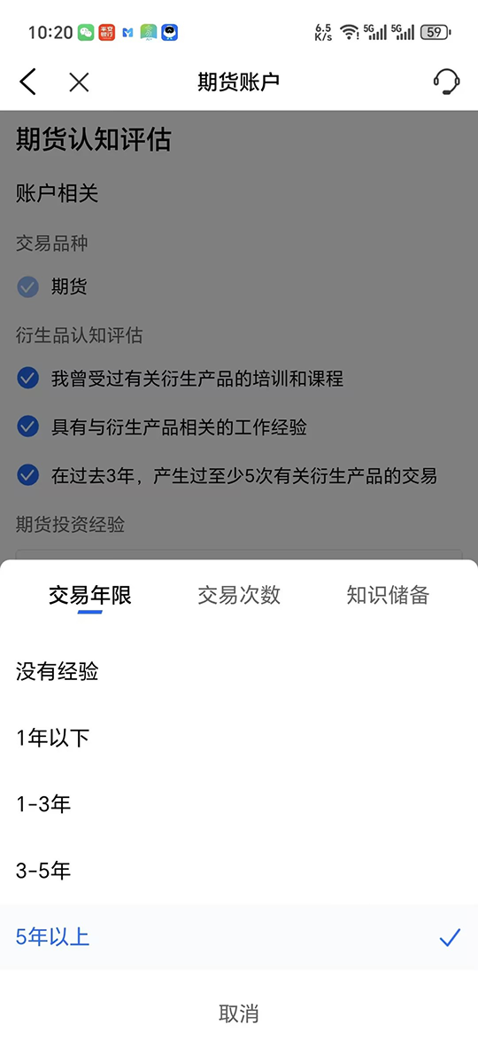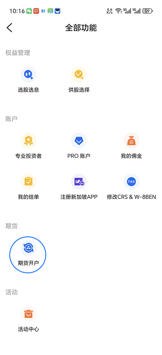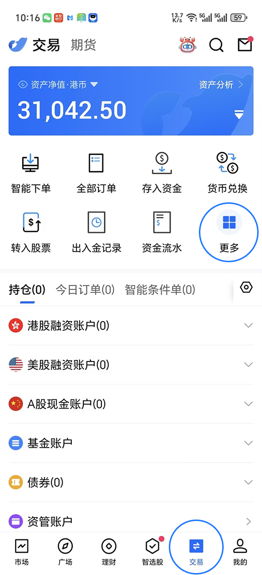 步骤1: 选择“交易“,选择在”更多“,最后选择“期货账户”。